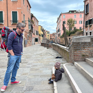 Das Boot nach Venedig war sehr voll. Noch voller war Venedig selbst, obwohl eigentlich noch Nebensaison ist. Da wir beide schon mal in Venedig waren, konnten wir einfach so durch die Stadt laufen ohne Sehenswürdigkeiten zu verpassen. Wir sind zur guten Eisdiele im jüdischen Viertel gelaufen, wo Sylvie schon mal war. Juli hat älteren Jungs beim Fußballspielen zugeschaut und wir haben uns noch eine Pizza bestellt zum mitnehmen. Ein kurzer Stopp an der Rialtobrücke und dann ging es um 18:45 Uhr zurück Richtung Festland. Juli ist um 17:30 Uhr in der Kraxe eingeschlafen, was ein super powernap für ihn war und er bis 23 Uhr noch zu viel Energie hatte.